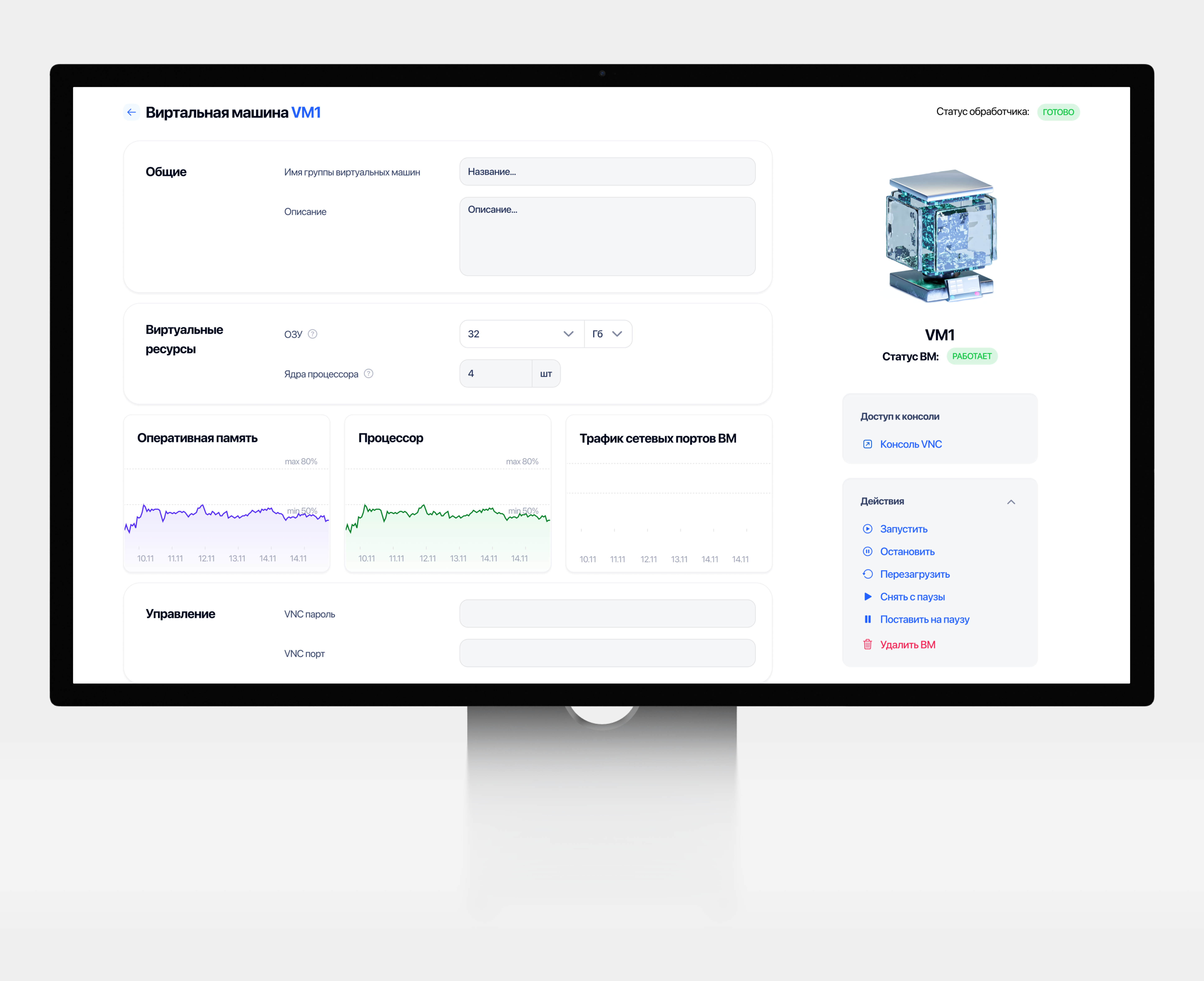 После создания сущности пользователь попадает на детальную страницу объекта — с графиками нагрузки в реальном времени, статусами, доступом к консоли и быстрыми действиями.