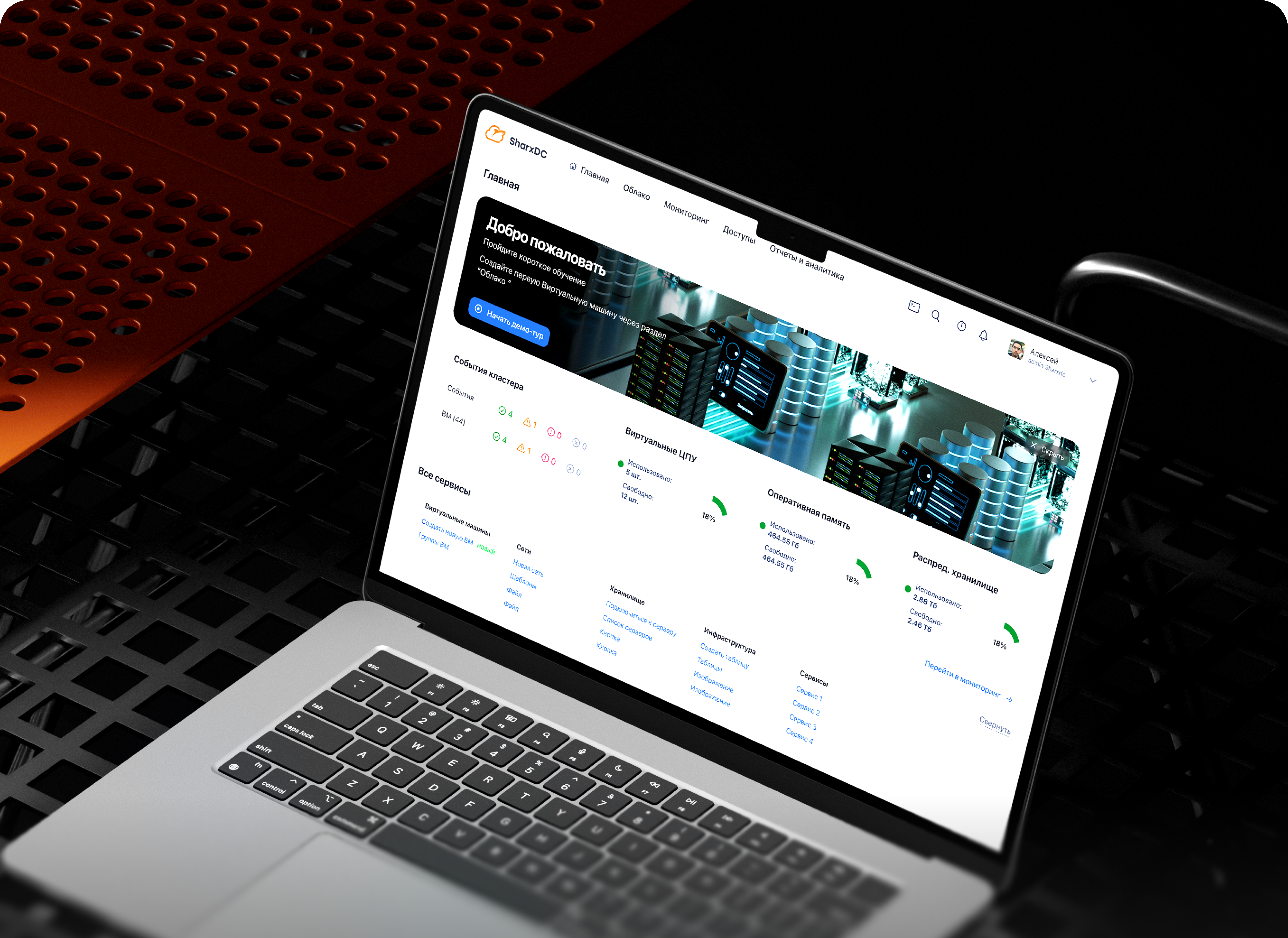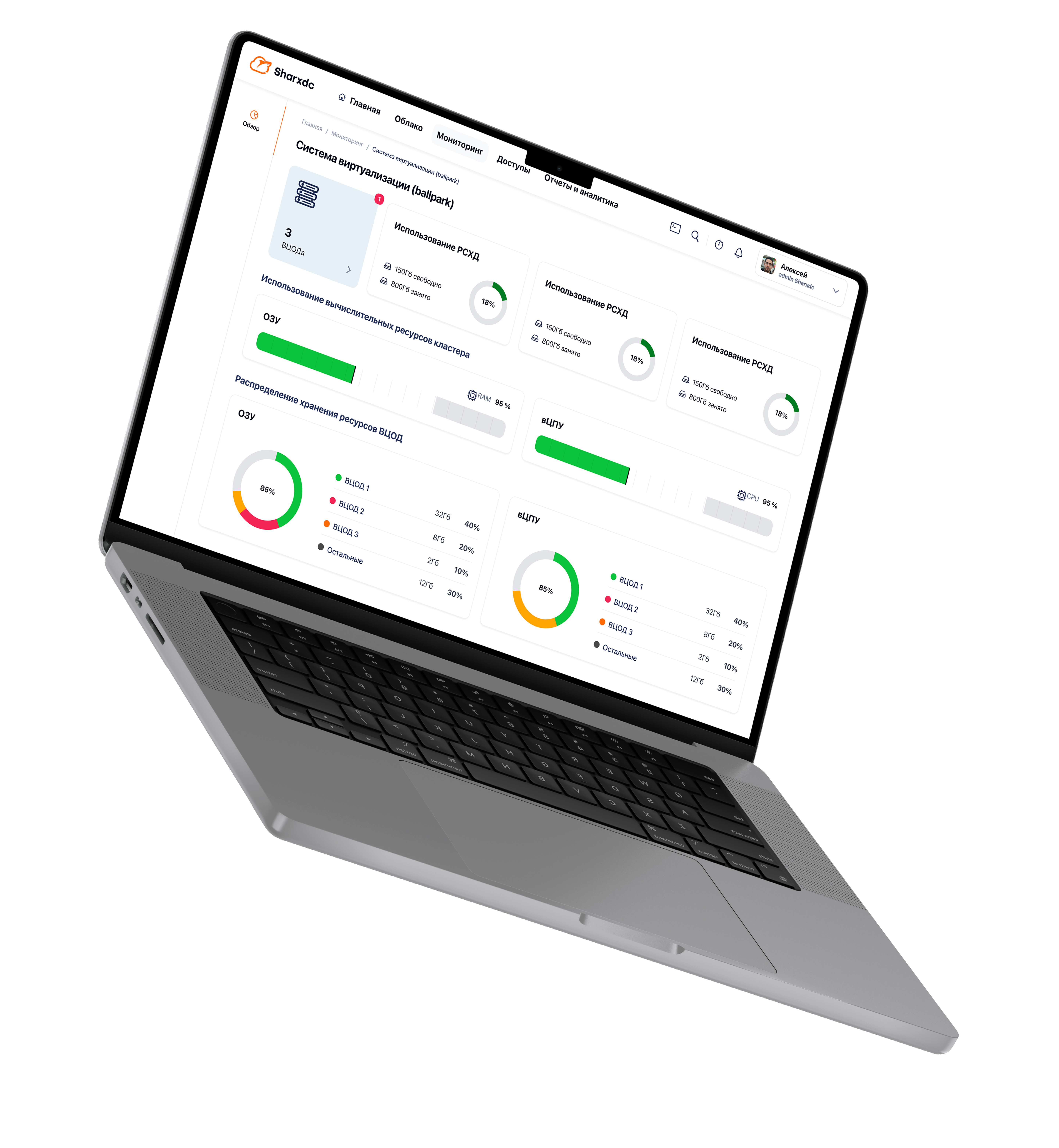 Главная страница встречает пользователя онбордингом и сразу показывает полный срез инфраструктуры: список виртуальных машин, доступные сети и хранилища, ключевые события кластера. Отдельная панель отображает ресурсы в реальном времени — виртуальные ЦПУ, оперативную память, распределённое хранилище.