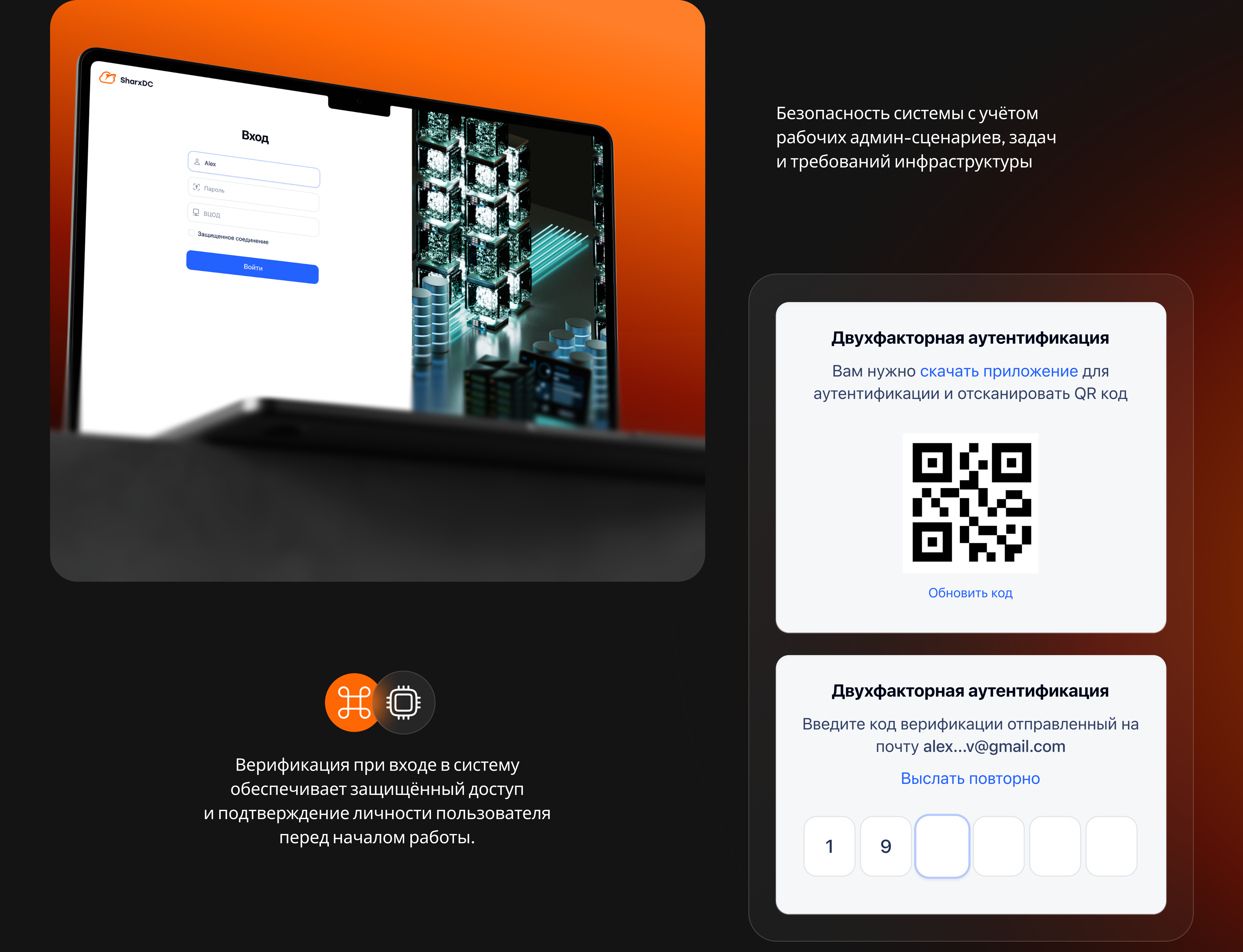 Авторизация — первая точка контакта пользователя с системой. Мы спроектировали минималистичный экран входа с поддержкой защищённого соединения, а также полноценный флоу двухфакторной аутентификации через приложение или код на почту.