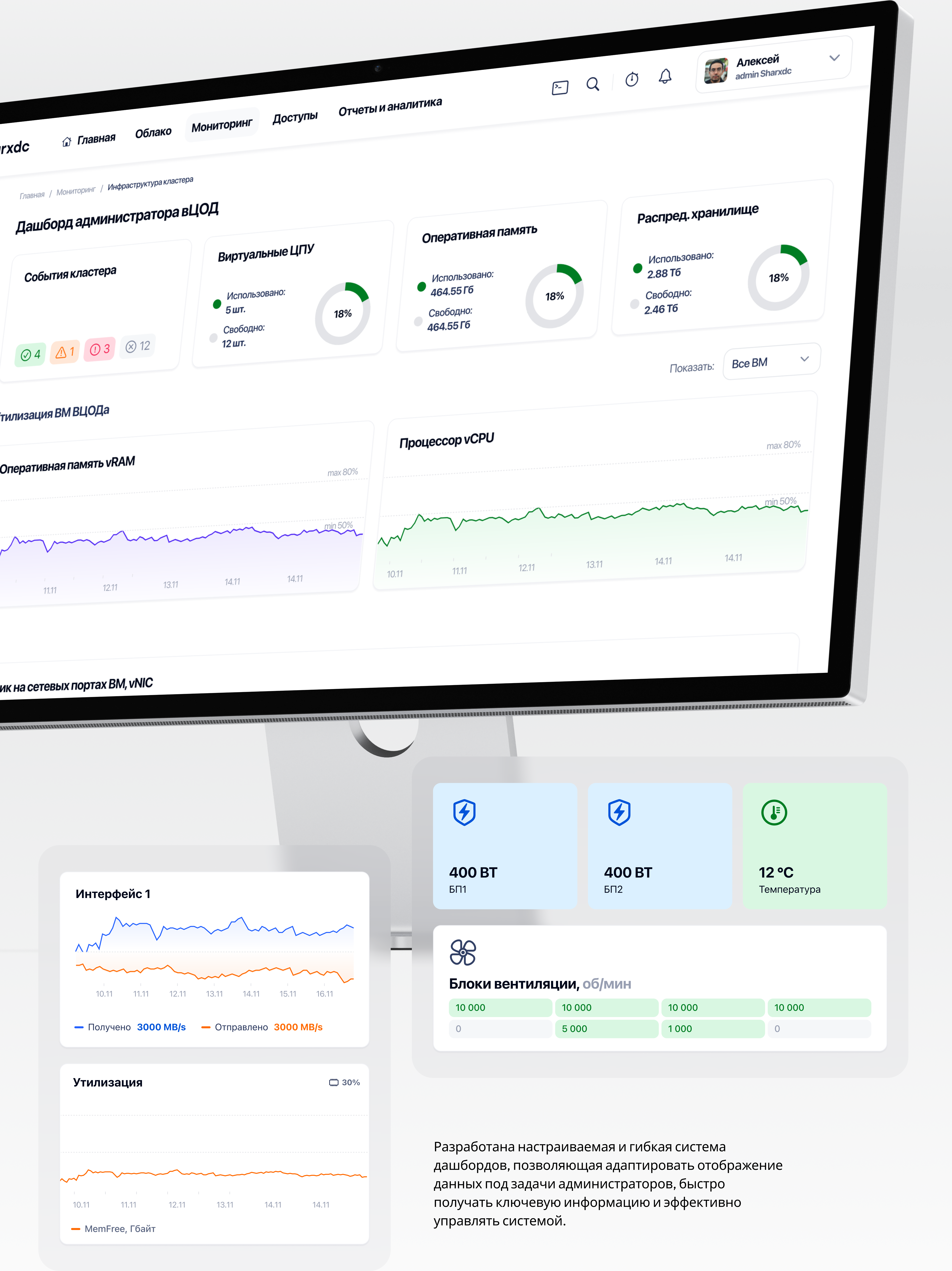 Для администраторов ВЦОД мы разработали специальный дашборд с детализацией по каждому виртуальному центру обработки данных: утилизация ресурсов, графики нагрузки по времени, мониторинг сетевых интерфейсов и физических параметров узлов — температура, питание, блоки вентиляции.