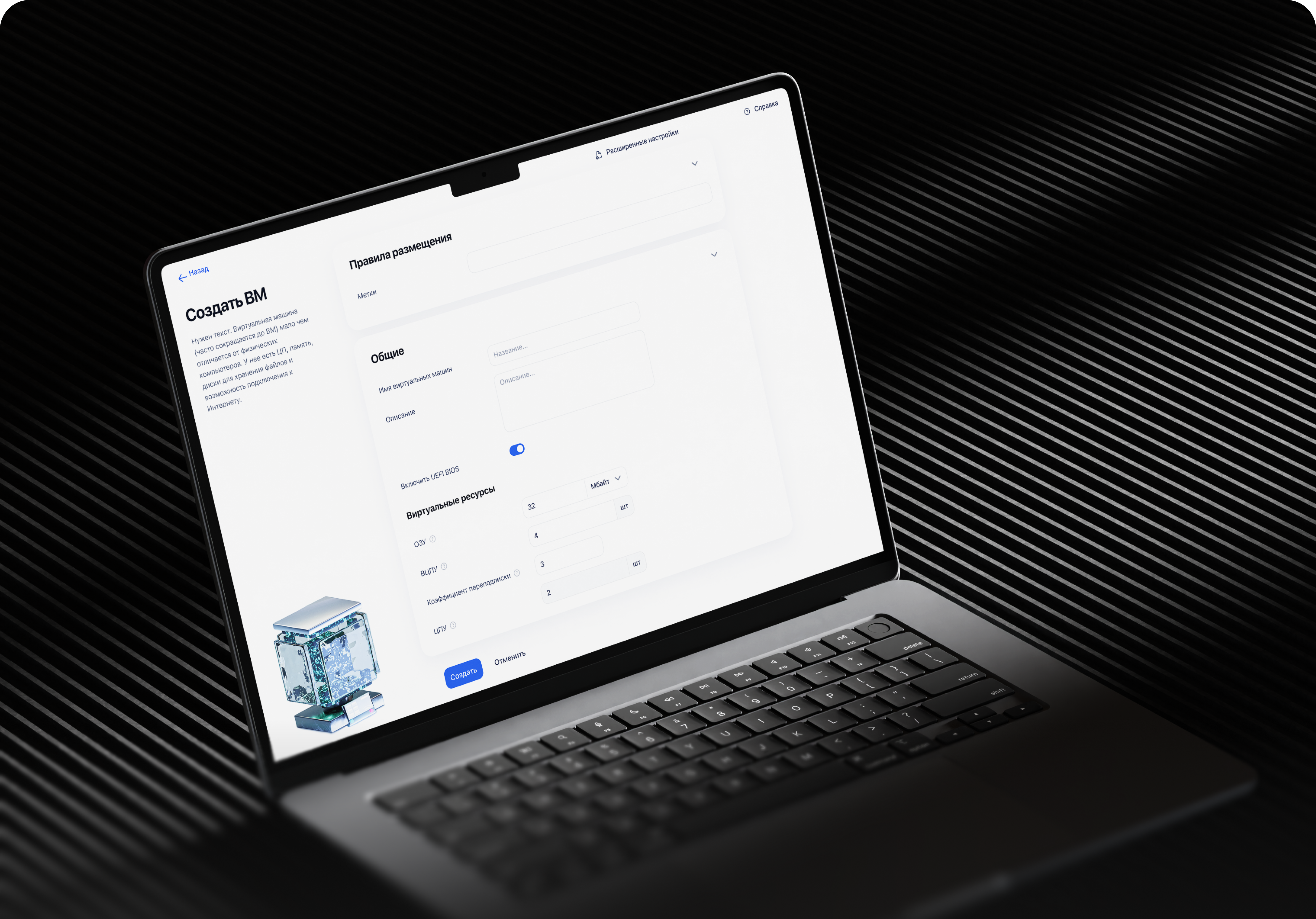 Создание виртуальных машин и других объектов инфраструктуры — одна из ключевых операций в платформе. Мы спроектировали пошаговые формы с контекстными подсказками, которые ведут пользователя через настройку ресурсов: имя, описание, виртуальные ЦПУ, ОЗУ, диски и правила размещения.