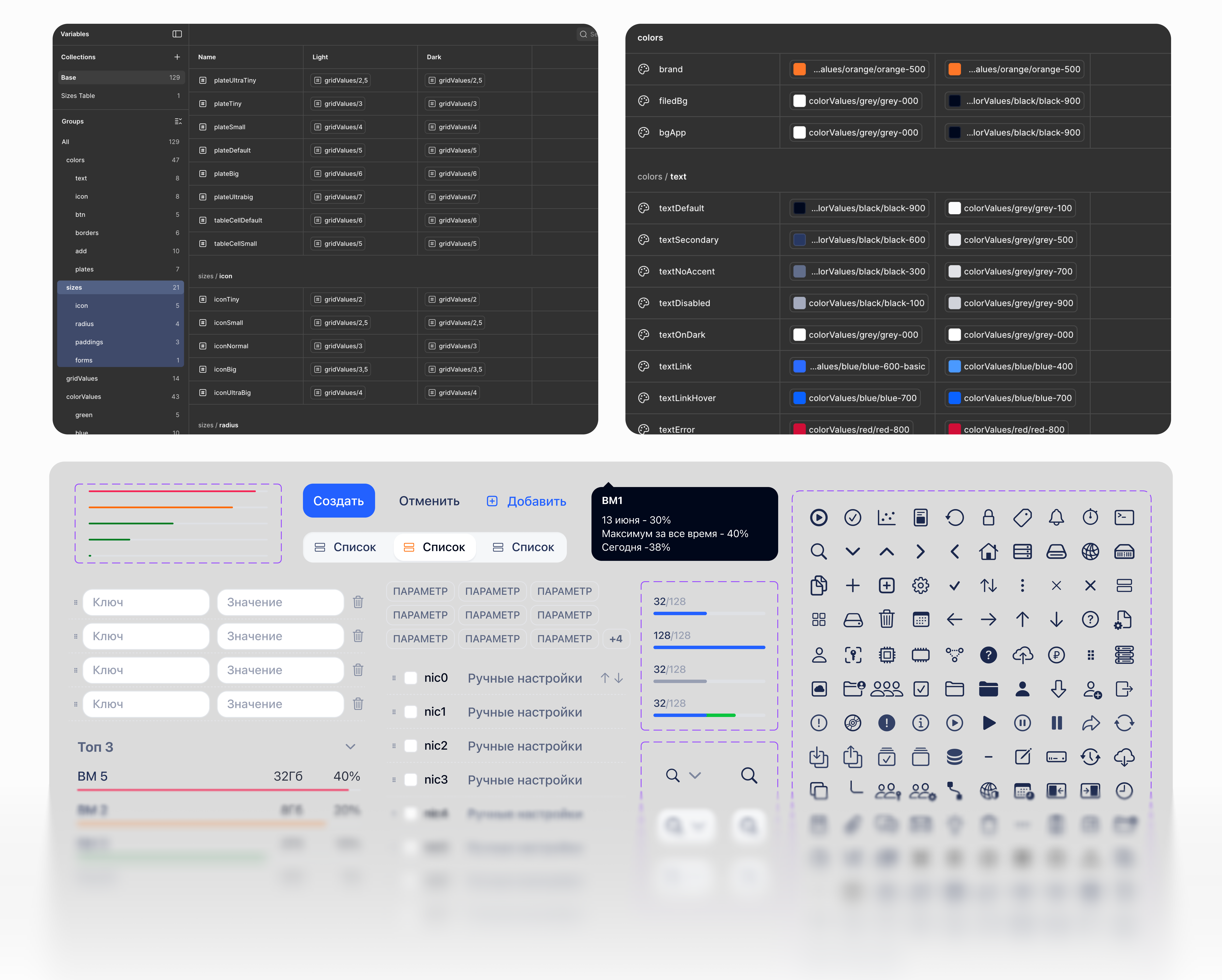 Все цвета реализованы через семантические токены: textDefault, textSecondary, textLink, filedBg, bgApp и другие. Это обеспечивает консистентность интерфейса при переключении тем и значительно ускоряет разработку. Иконки вынесены в отдельную библиотеку и охватывают все сценарии платформы.